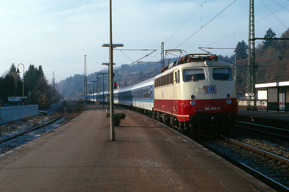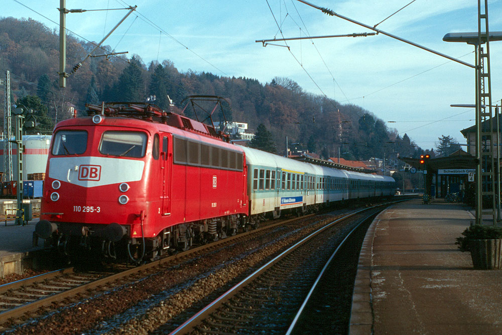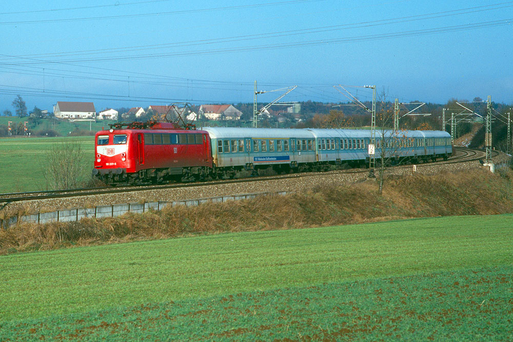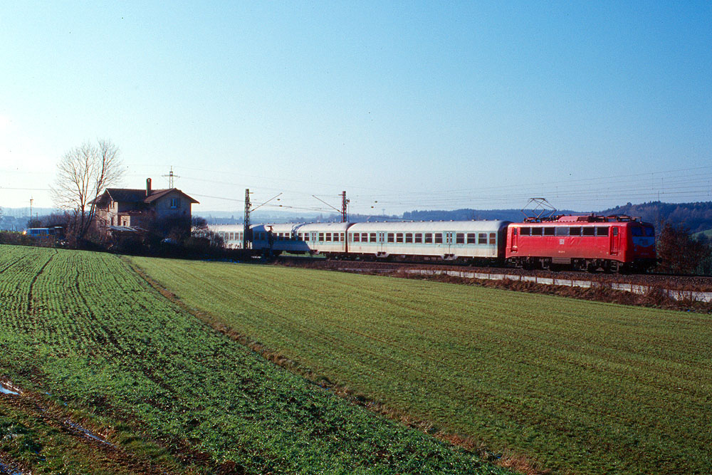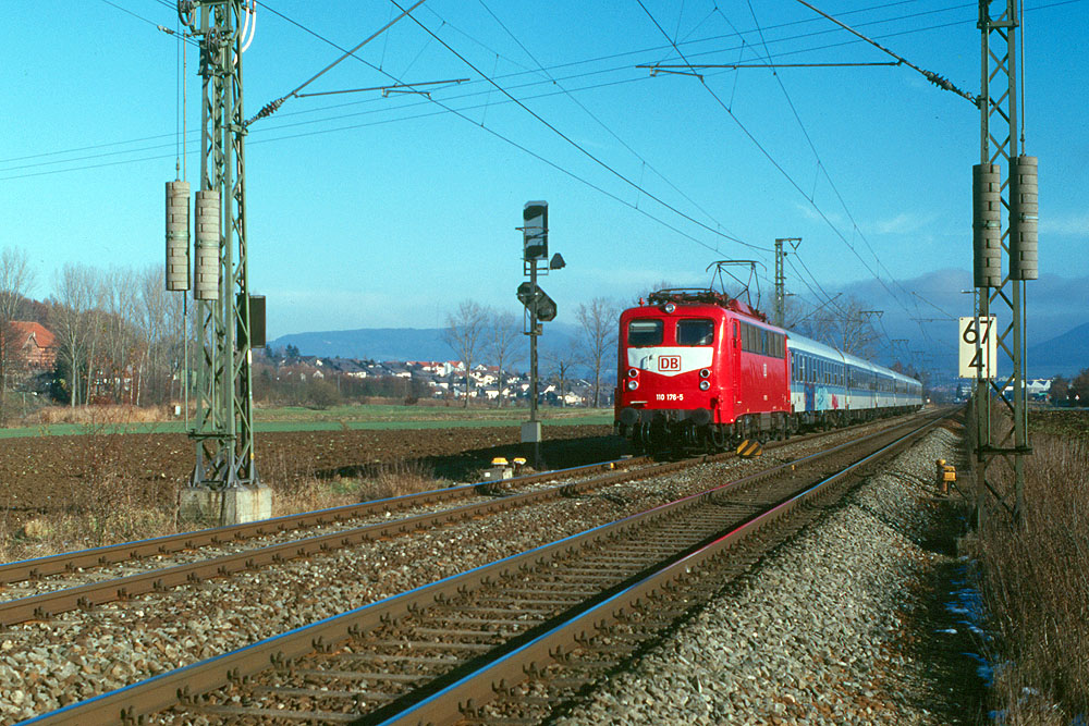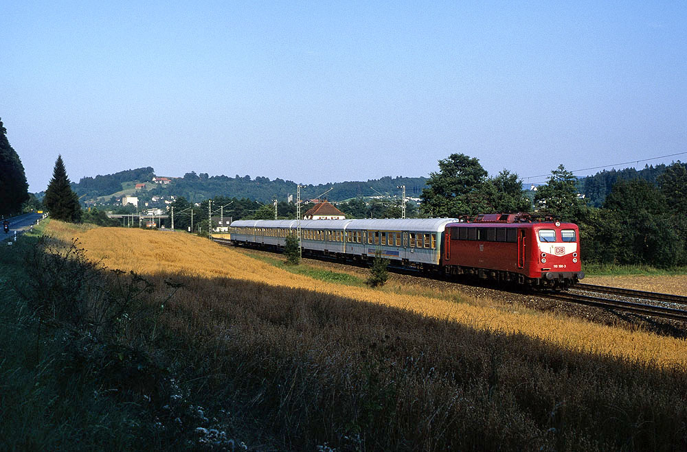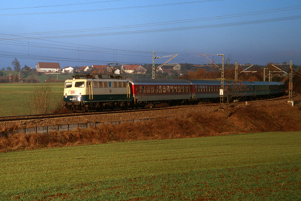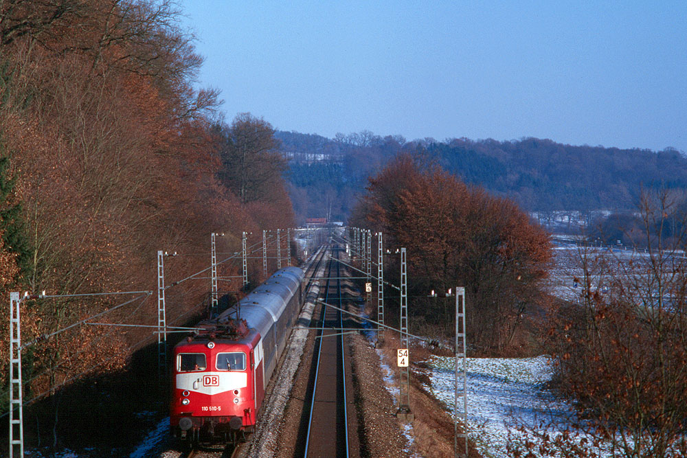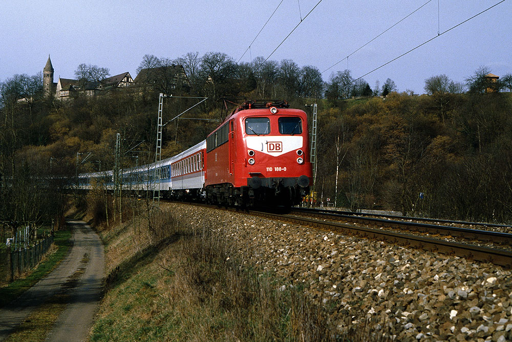 Bild 7: Vor den IR im Abschnitt Nürnberg- Stuttgart reichte damals noch eine 110. 110 198 vor IR2664. Heute fahren dort IC2, gebildet aus 147.5 und Doppelstockwagen- bei faktisch gleichen Fahrzeiten.