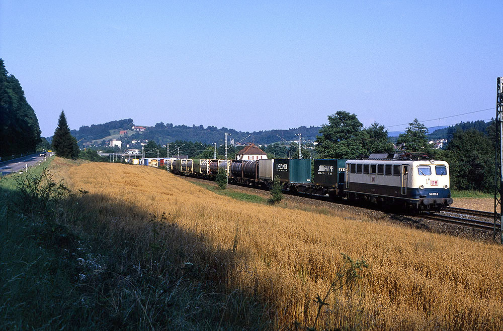 Bild 3: 140 125 vor einem Containerzug. Damals war die Murrbahn noch nicht elektrifiziert und die Güterzüge aus Richtung Nürnberg machten den Umweg über die Remsbahn.
