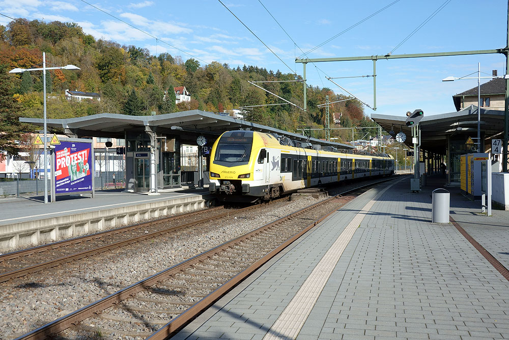 Bild 3: Der gleiche Triebwagen fährt aus dem Bahnhof Rudersberg aus.