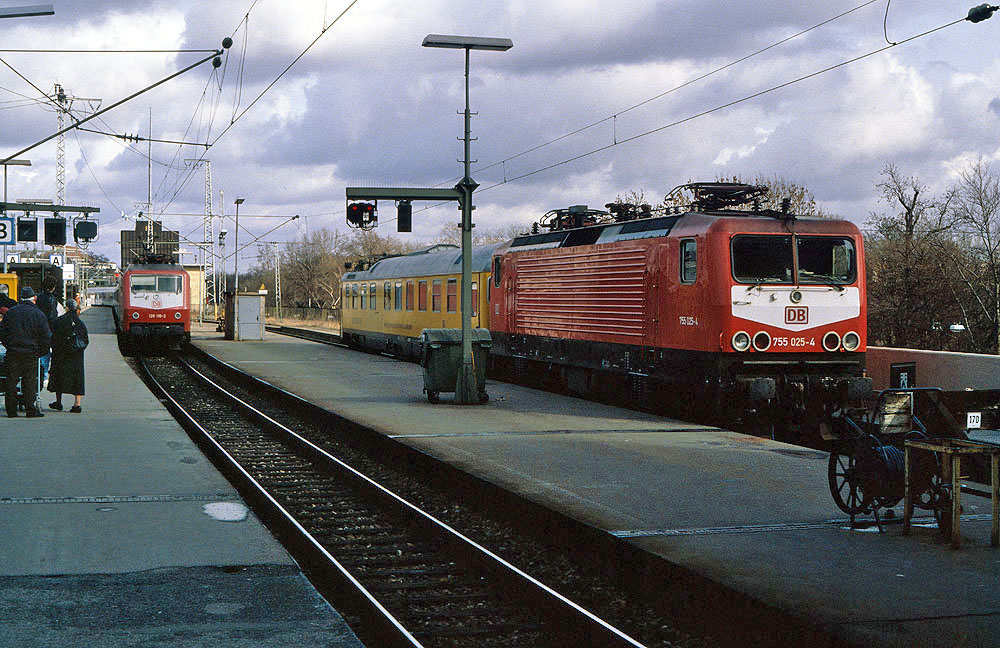 Bild 3 und 4: Wieder mal war ein Messzug auf Gleis 17 vom Stuttgarter Hauptbahnhof abgestellt, diesmal mit 755 025 (ex DR 112 025). Ich warte auf meinen IR2565, den 120 110 von Karlsruhe nach Stuttgart gezogen hat. Damals wurde für die Weiterfahrt Richtung Nürnberg noch auf 110 umgespannt.