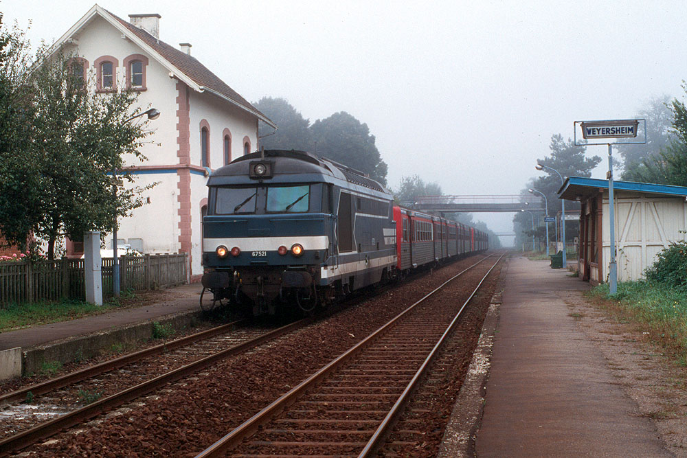 Bild 3 und 4: Gambsheim liegt an der Strecke Strasbourg- Lauterbourg. An der Spitze von 65718 der Steuerwagen X8322.
