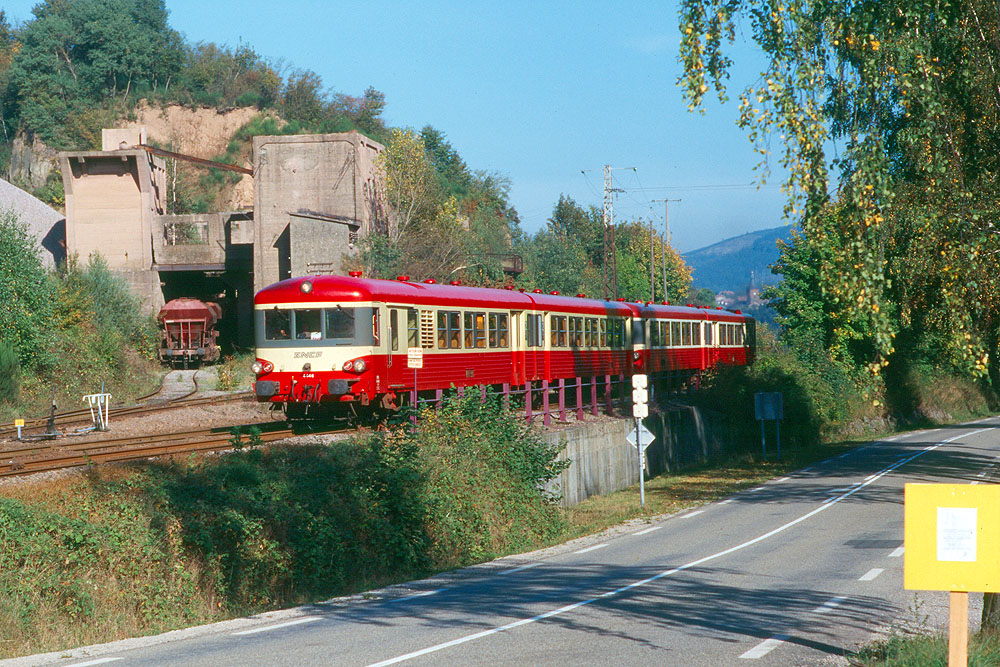 Bild 7: Kurz vor Schirmeck gab es damals noch ein befahrenes Anschlussgleis zu einem Steinbruch. X4446 und 4383 als 60848.