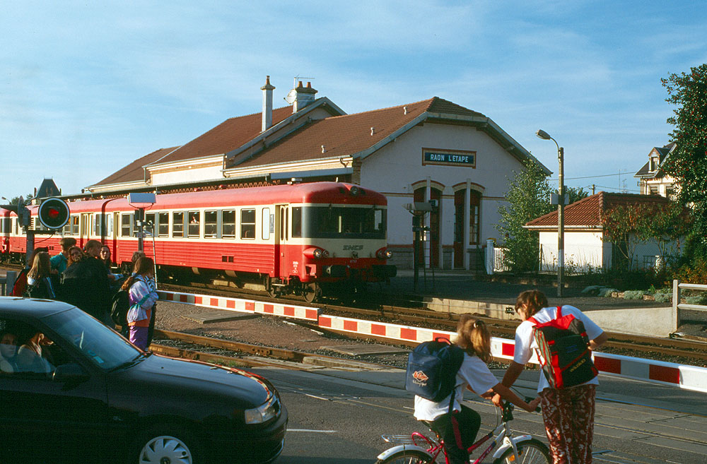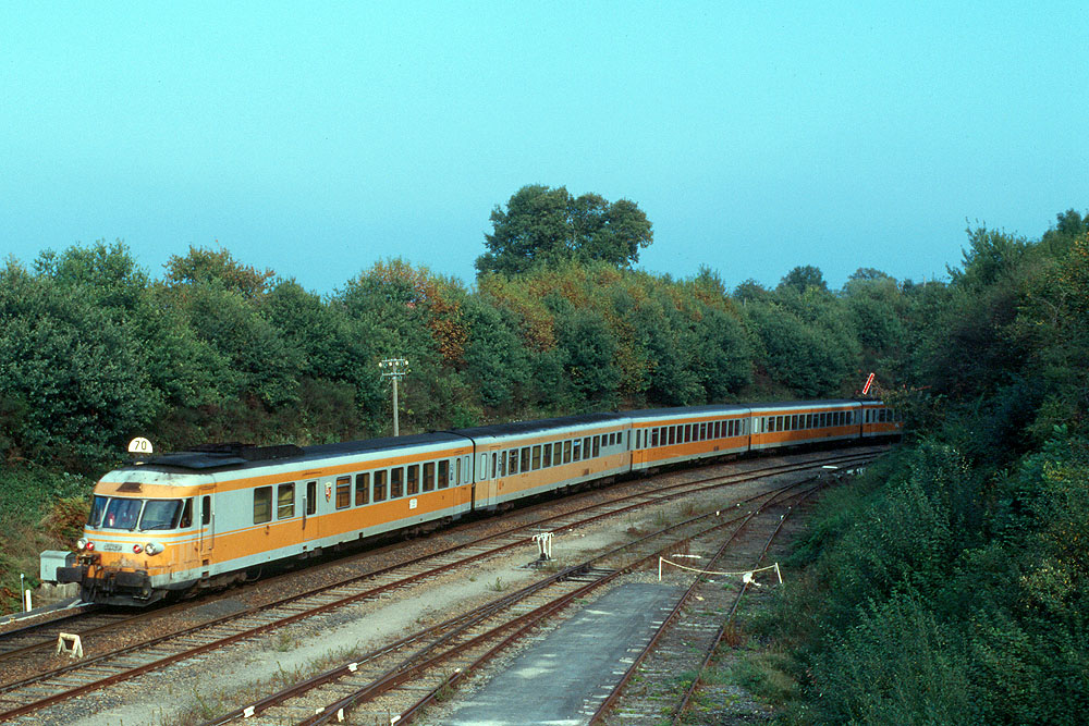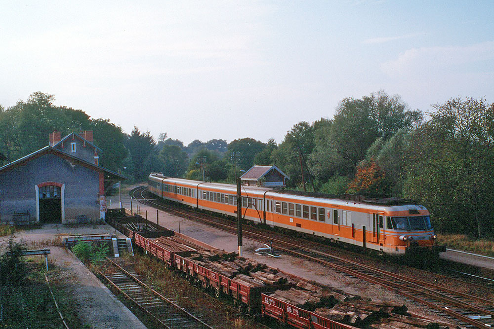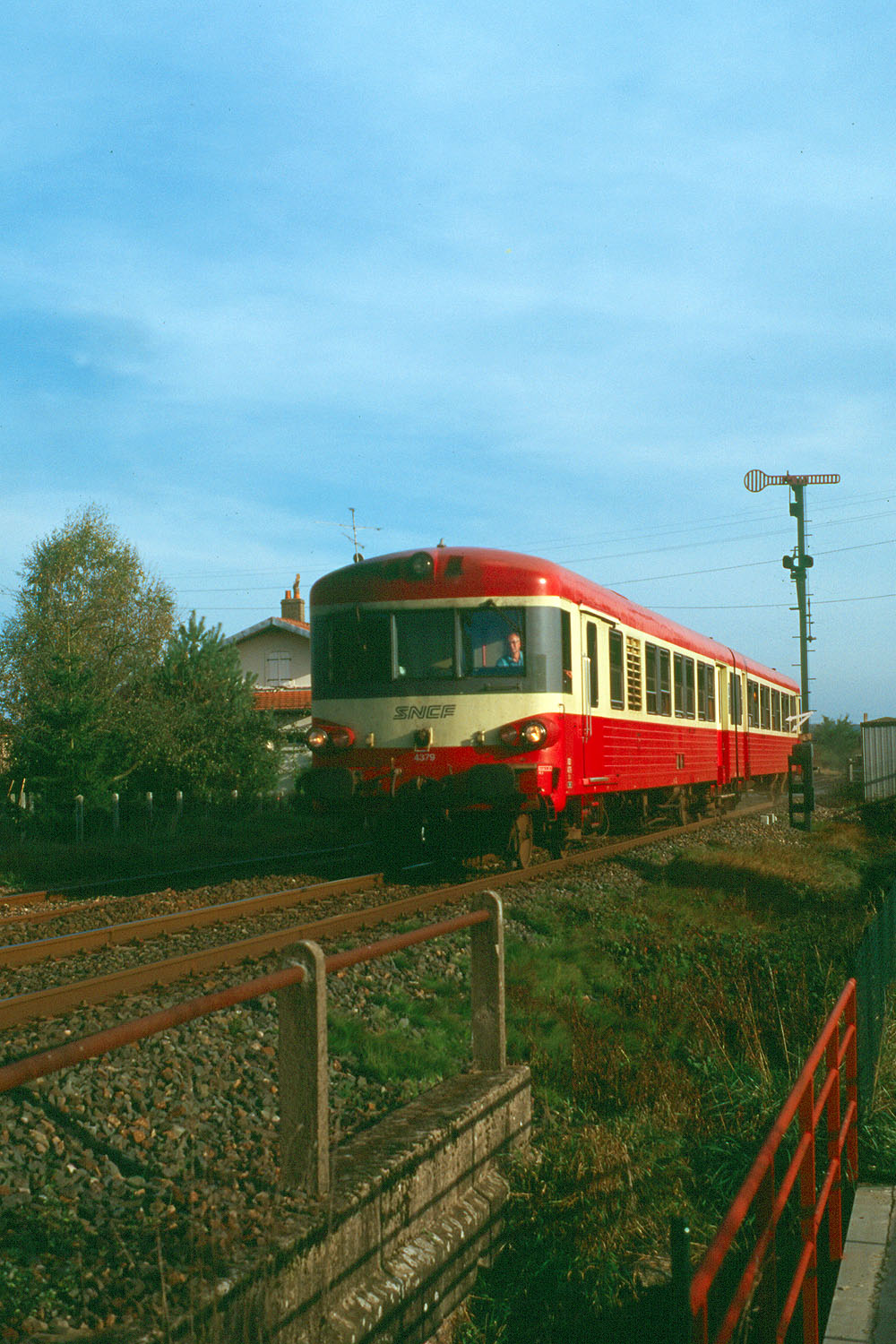 Bild 17: X4379 als 62958 einfahrend in den Bahnhof von Azerailles. Der Tw passiert das "zusammengefasste" Ausfahrtformsignal. Leider habe ich damals überhaupt nicht auf die Signale in Frankreich geachtet. Das gezeigte ist wohl ein Semaphore der Bauform 1934? Wir befinden uns nicht mehr auf dem Streckennetz der ehemaligen EL/AL, die Strecke gehörte zur EST.