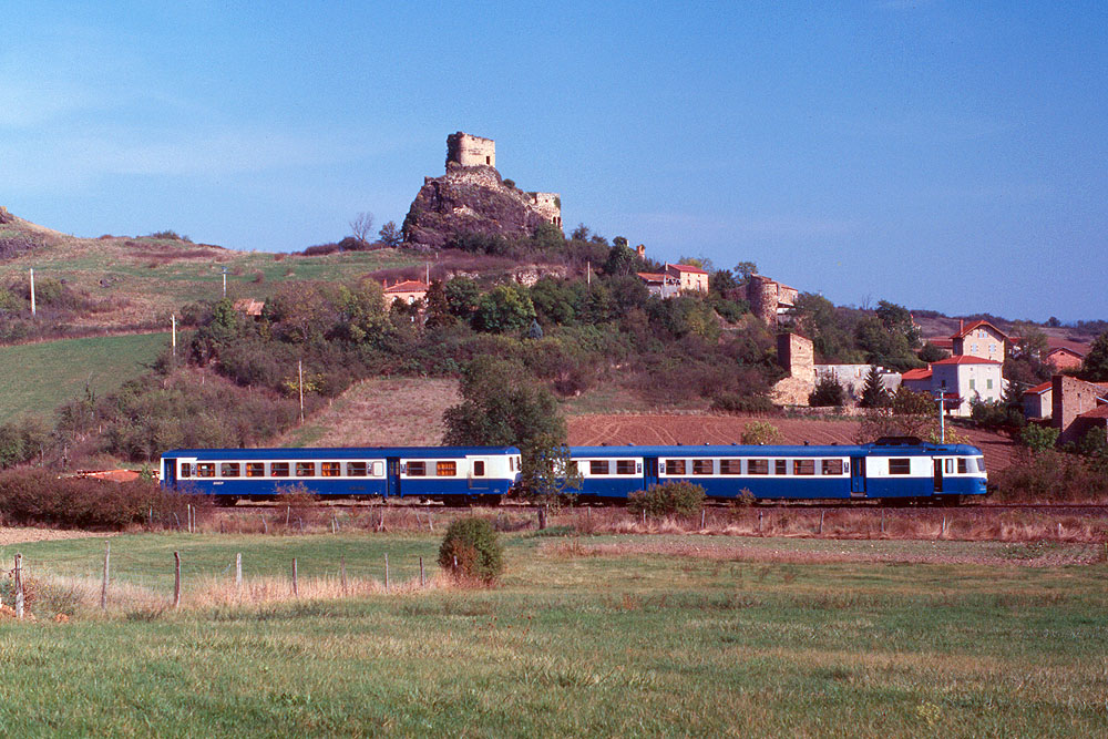 Bild 1: Triebwagen X2900 als 59575 auf der Fahrt Richtung Roanne. Im Hintergrund St. Germain- des Fosses. X2800 sind Triebwagen, die speziell für steigungsreche Strecken gebaut wurden.