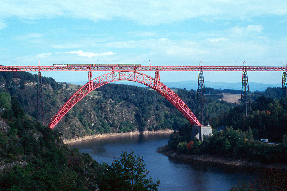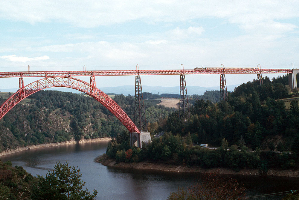 Bild 30 und 31: Auf dem Viaduc du Garabit BB9630 vor 5950 (Le Cevenol, Beziers- Paris). (KBS 544) Im Hintergrund Bauarbeiten für die Autobahn. Man beachte auch die Oberleitung mit ihren Portalmasten.