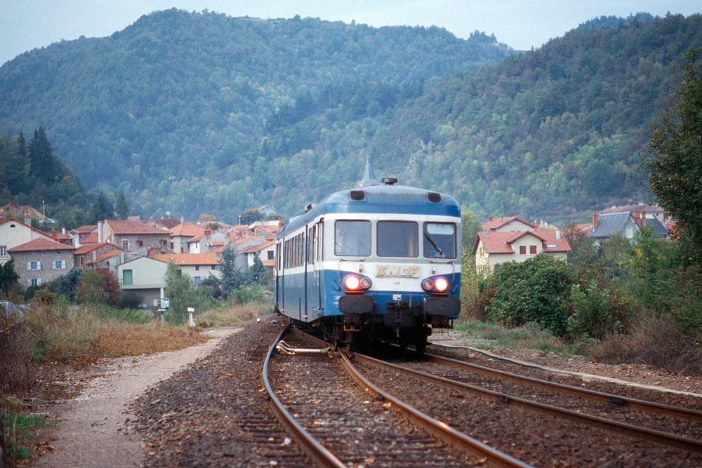 Bild 8: Diese Aufnahme sollte etwas östlich von Thiers auf der 545 entstanden sein. Sieht mir stark nach Pont Barbarin aus. Die X2800 fahren als 57577 Richtung Montbrison und Loire. Die Strecke ist heute in diesem Abschnitt stillgelegt.