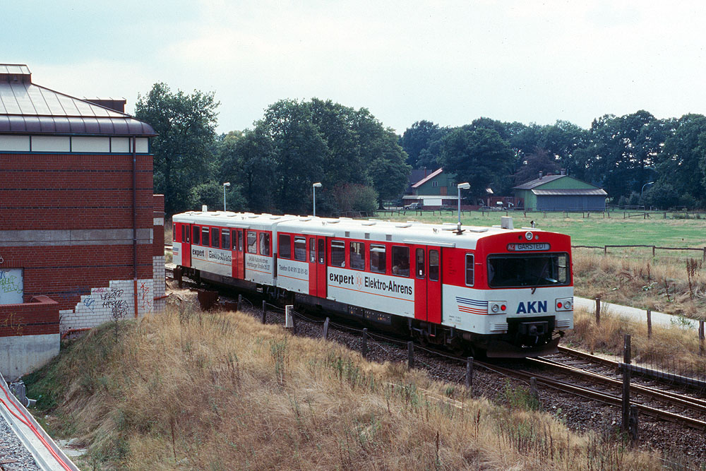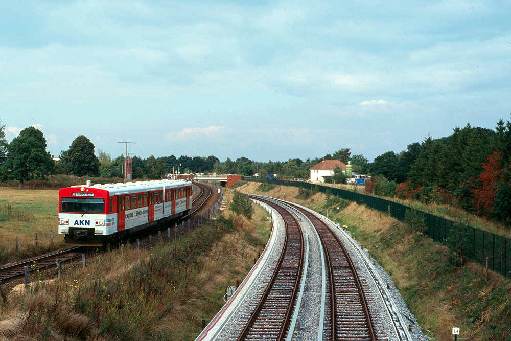 Bild 1: Ich stehe auf einer Behelfsbrücke am heutigen Haltepunkt (Garstedt) Richtweg der U1 und blicke Richtung Norderstedt- Mitte. Die U Bahnstrecke erscheint weitgehend fertiggestellt. Links fährt ein unbekannter VT2 auf der alten ANB (A2) Trasse Richtung Garstedt.
