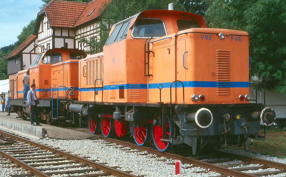Bild 3 und 4: Ausgestellt wurde MAK 600D, noch beschriftet als FVE 62 ( Farge Vegesacker Eisenbahn), im Einsatz für die WEG. Leider habe ich diese Lok nicht im Einsatz fotografieren können. Später tauchte noch eine MAK 1200D im Kochertal auf, ex V122 der RStE.