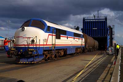 29.8.2006 Güterwagen aus einer kombinierten Eisenbahn- und LKW Fähre heraus.