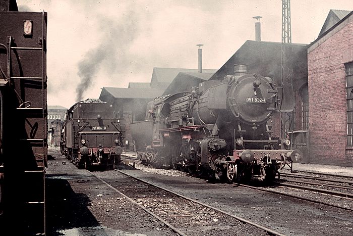 | Noch eine Aufnahme vom Bw Saarbrücken. Vor dem Rechteckschuppen setzt 051832, gekuppelt