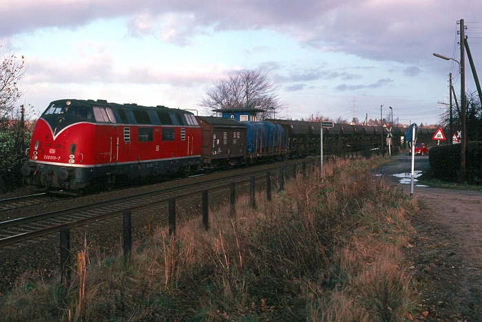 Hagenweg. 220 013 rollt am 19.11.80 mit einem gemischten Güterzug Richtung